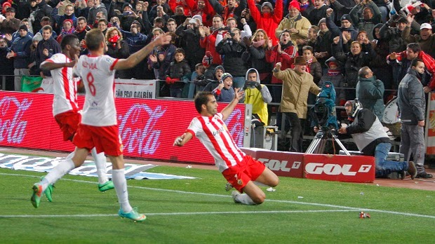 Poco a poco la grada empieza a creer en que los puntos no tenían porque volar necesariamente del Estadio, por mucho que el rival fuera el líder. Y esa confianza creció cuando Aleix Vidal realiza una gran jugada personal, desborda a cuantos contrarios le salen la paso y lanza un gran disparo raso que besa los dos palos y no entra.