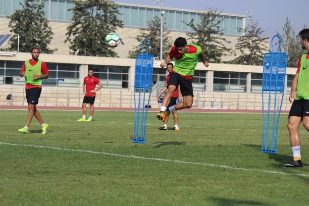 Fran Rodríguez, que hoy puede ser titular, remata de cabeza en un ejercicio llevado a cabo ayer en el anexo del Estadio de los Juegos Mediterráneos. / UDA